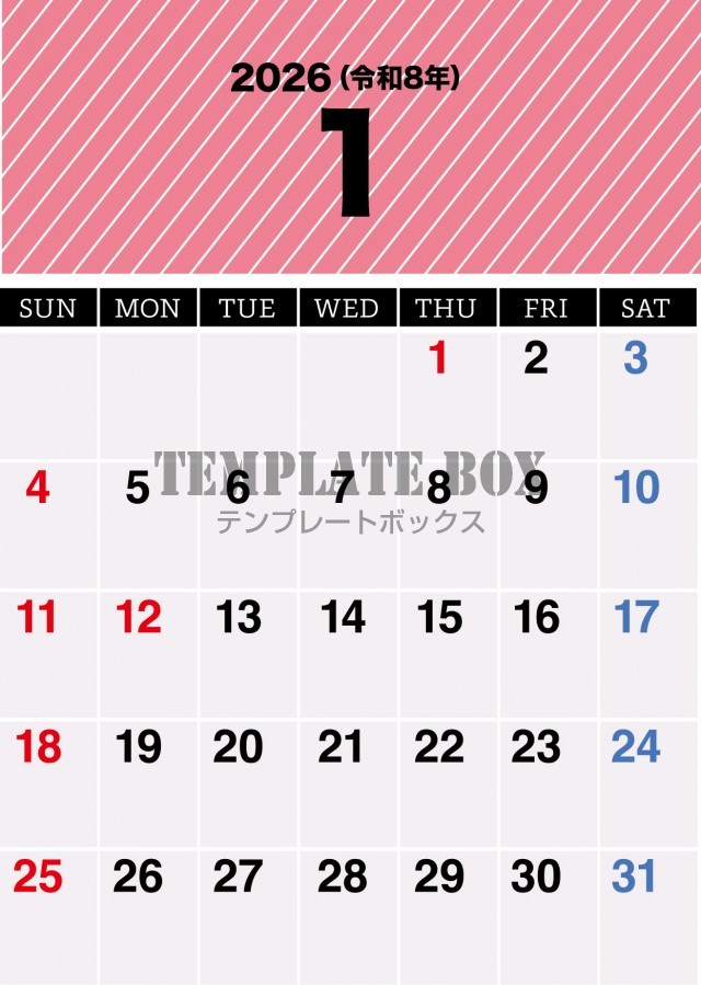無料テンプレート:2026年1月カレンダー:縦型のストライプ柄のカレンダー