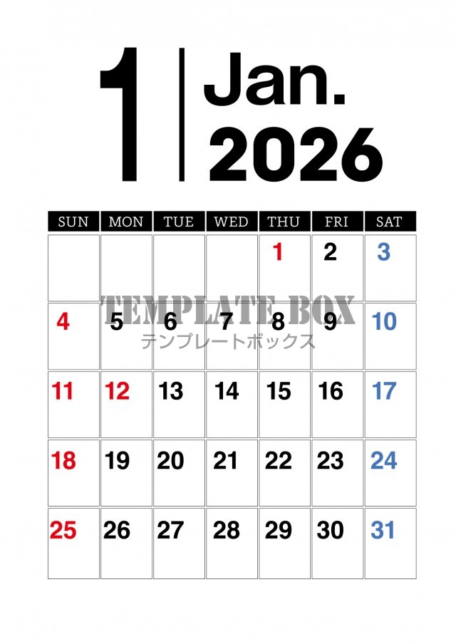 数字がみやすいデザインが特徴的なカレンダーです。2026年1月カレンダー…