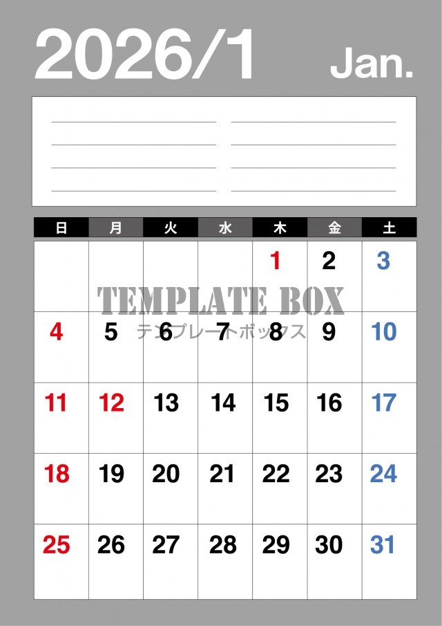 無料テンプレート:2026年1月カレンダー:縦型モノクロメモ付きカレンダー