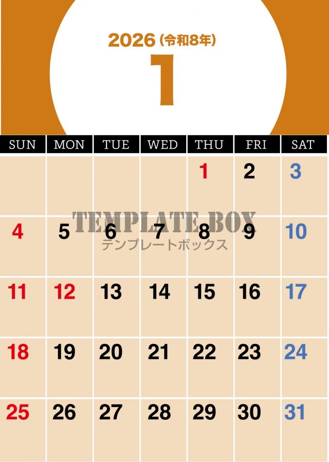 無料テンプレート:2026年1月カレンダー:縦型ブラウンカラーカレンダー