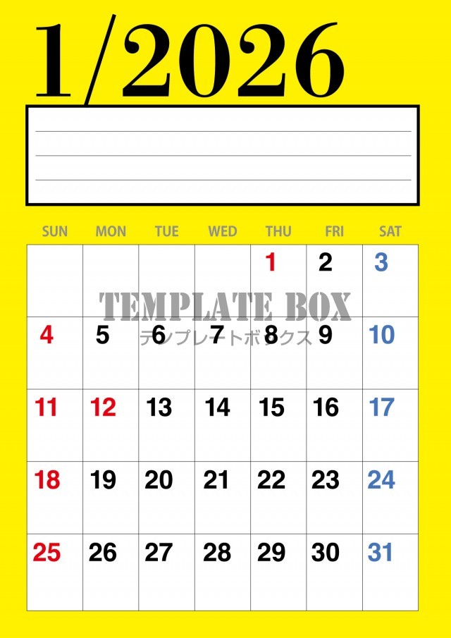 無料テンプレート:2026年1月カレンダー:縦型イエローカラーカレンダー