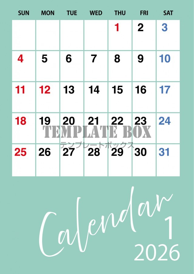 数字がみやすいデザインが特徴的なカレンダーです。2026年1月カレンダー…