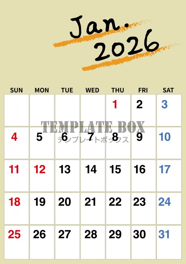 無料テンプレート:2026年1月カレンダー:縦型ナチュラルカラーカレンダー