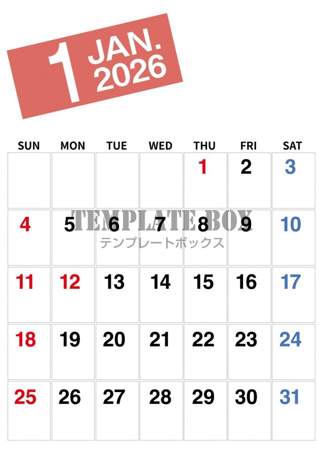 無料テンプレート:2026年1月カレンダー:縦型シンプル使いやすいカレンダー