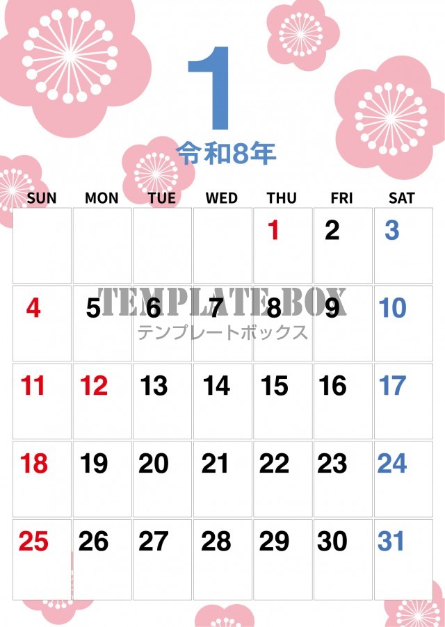 無料テンプレート:2026年1月カレンダー:縦型梅の花デザインカレンダー