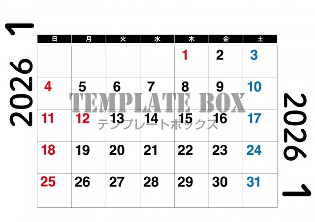 2026年1月カレンダー:横型の枠で仕切られたカレンダー
