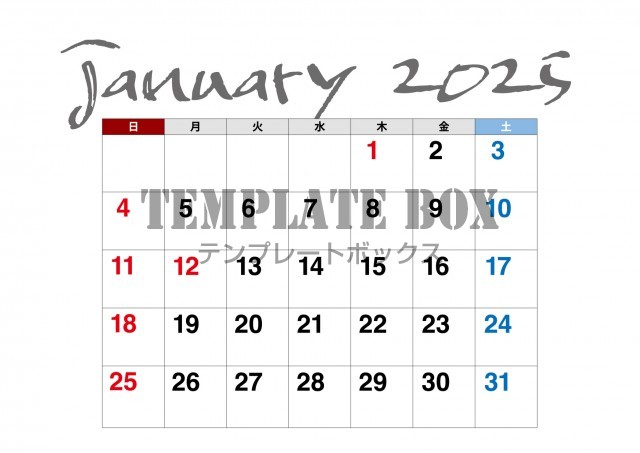 無料テンプレート:2026年1月カレンダー:横型の枠で仕切られたカレンダー