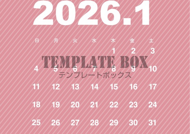 無料テンプレート:2026年1月カレンダー:横型ピンクのカレンダー