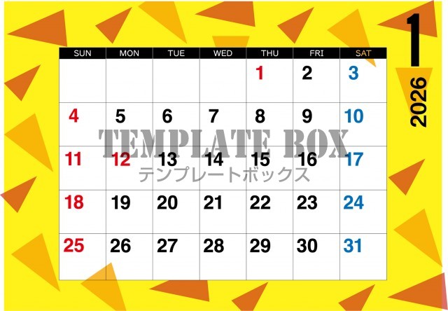 無料テンプレート:2026年1月カレンダー:横型黄色のモダンカレンダー