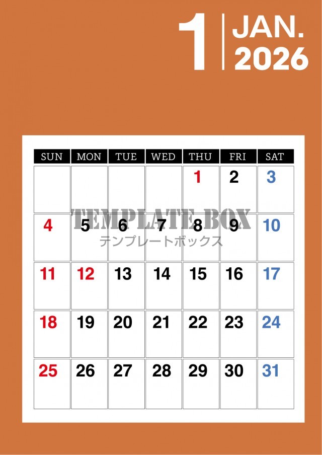無料テンプレート:2026年1月カレンダー:縦型ブラウンカラーカレンダー