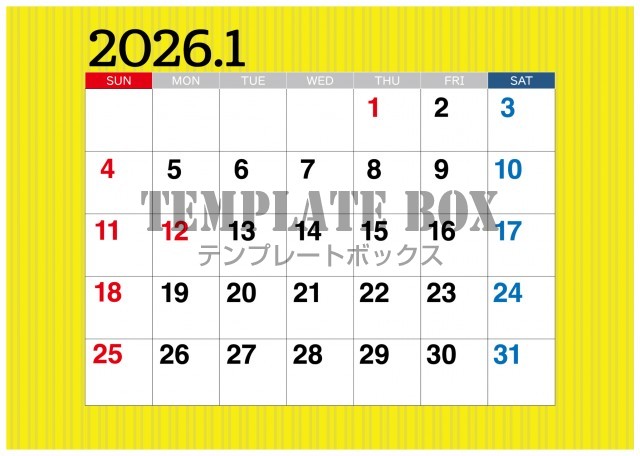 無料テンプレート:2026年1月カレンダー:黄色の横型カレンダー