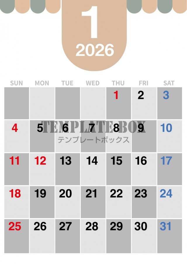 無料テンプレート:2026年1月カレンダー:縦型モダンなシンプルカレンダー