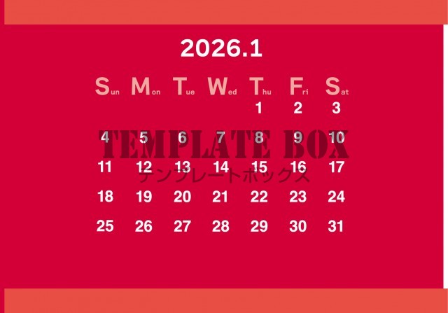 無料テンプレート:2026年1月カレンダー:横型赤のおしゃれなカレンダー