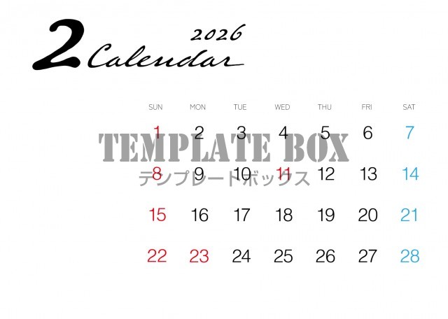 無料テンプレート:2026年2月カレンダー:横型白のシンプルカレンダー