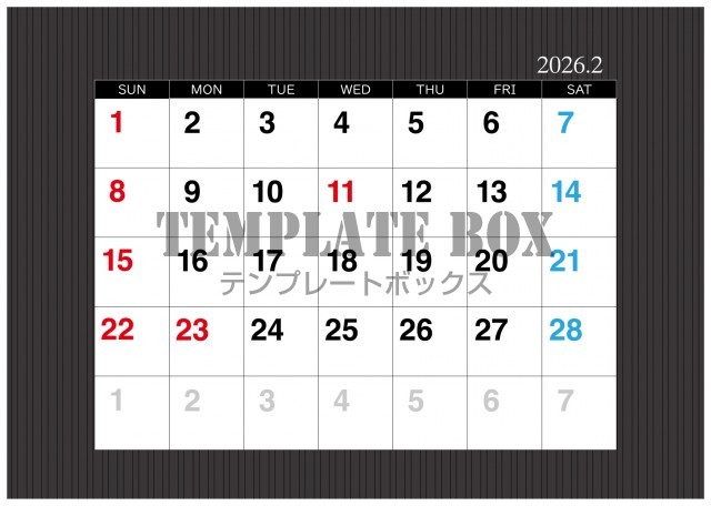 無料テンプレート:2026年2月カレンダー:冬のシンプルカレンダー