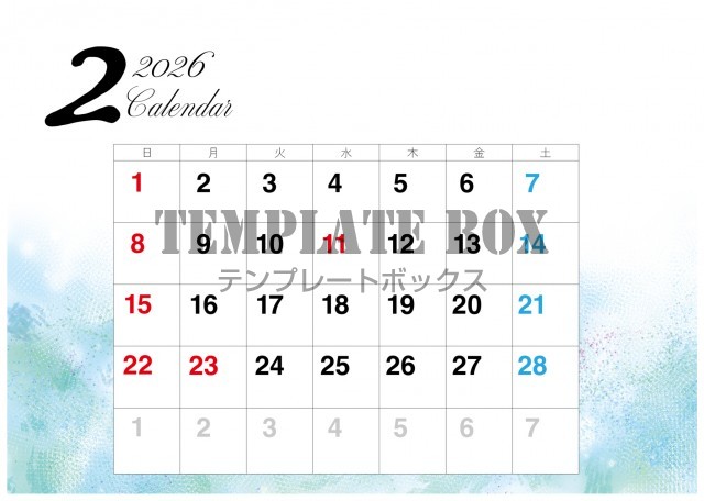2026年2月カレンダー:ブルーがおしゃれなデザイン