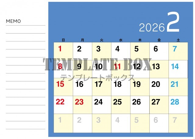 無料テンプレート:2026年2月カレンダー:横型メモ欄付きカレンダー