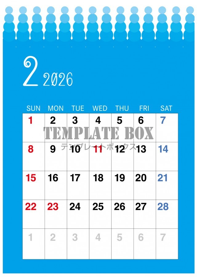 無料テンプレート:2026年2月カレンダー:縦型ドット柄カレンダー