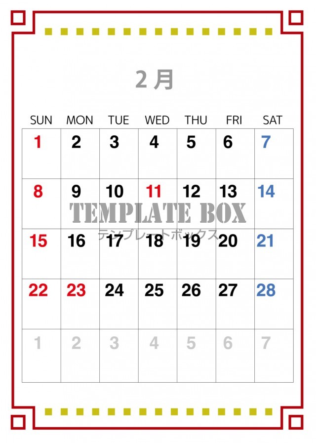 2026年2月カレンダー:縦型メモ欄付き便利素材