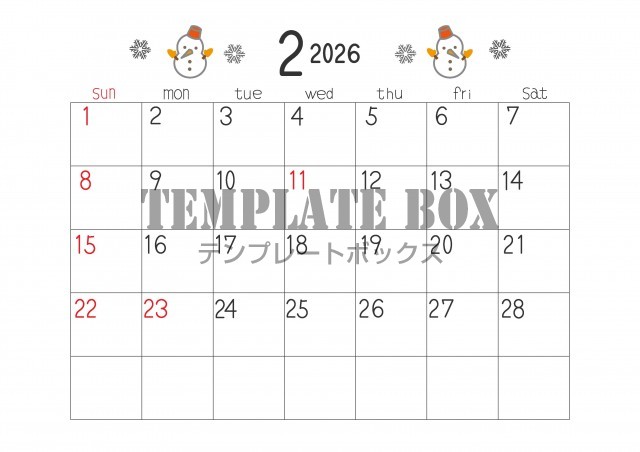 無料テンプレート:令和8年、2026年、横型のカレンダー素材、雪だるまのかわいいイラスト付き