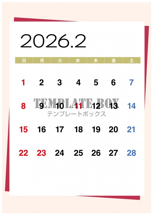 無料テンプレート:2026年2月カレンダー:縦型紙が重なっているおしゃれカレンダー