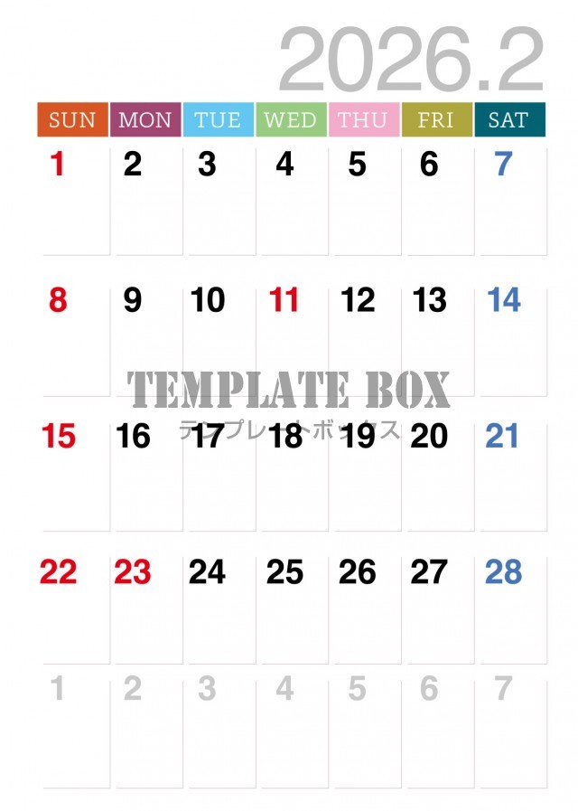無料テンプレート:2026年2月カレンダー:曜日がカラフルカレンダー