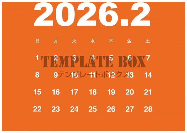無料テンプレート:2026年2月カレンダー:おしゃれオレンジカレンダー