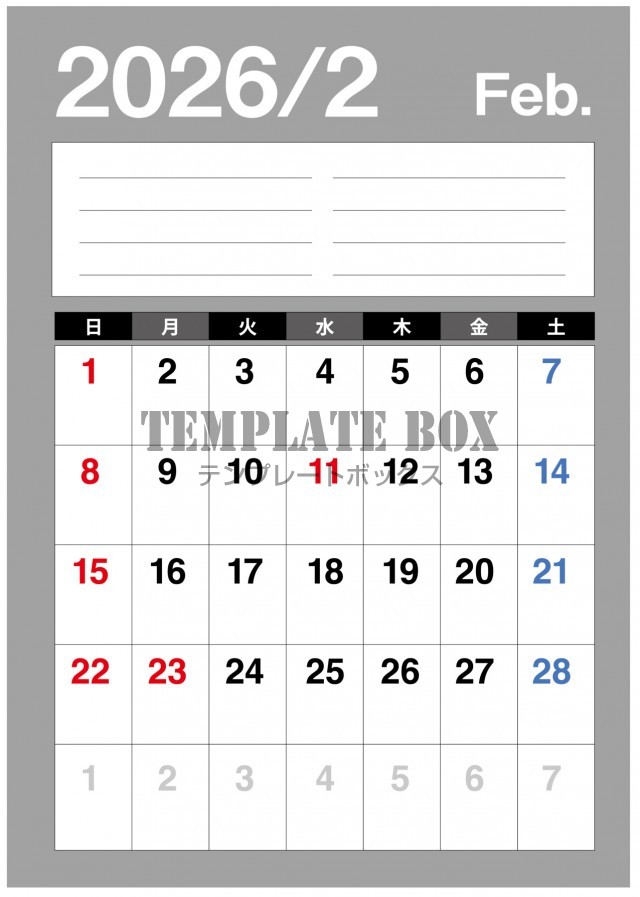 無料テンプレート:2026年2月カレンダー:縦型モノクロメモ欄付きカレンダー