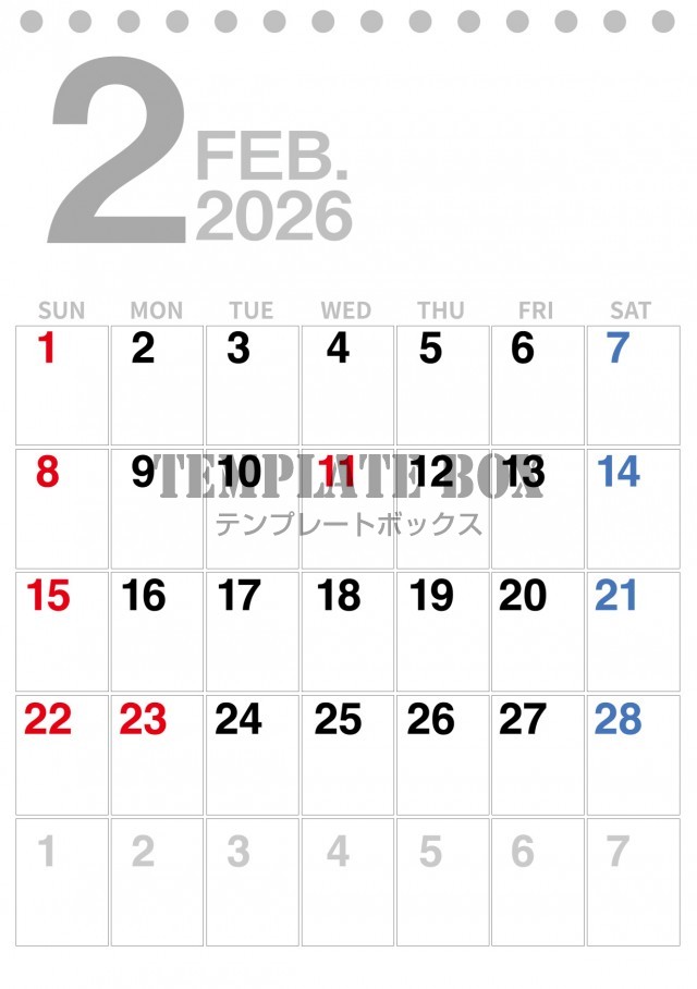 無料テンプレート:2026年2月カレンダー:縦型シンプルカレンダー
