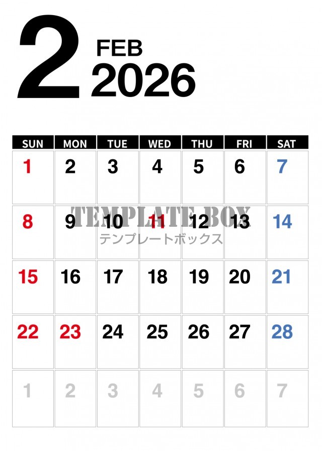 2026年2月カレンダー:縦型赤が目立つカレンダー