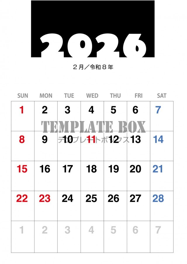 無料テンプレート:2026年2月カレンダー:縦型シンプルカレンダー