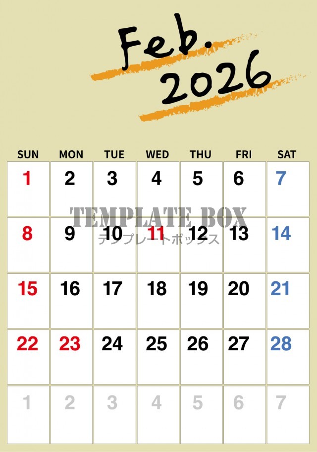 無料テンプレート:2026年2月カレンダー:縦型ナチュラルカレンダー