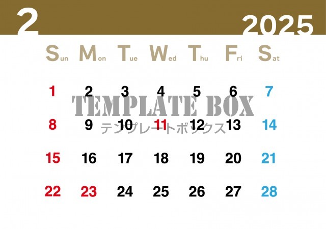 無料テンプレート:2026年2月カレンダー:シンプルブラウンカラー