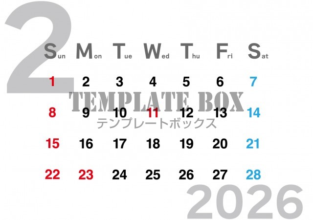 無料テンプレート:2026年2月カレンダー:横型シンプルデザイン