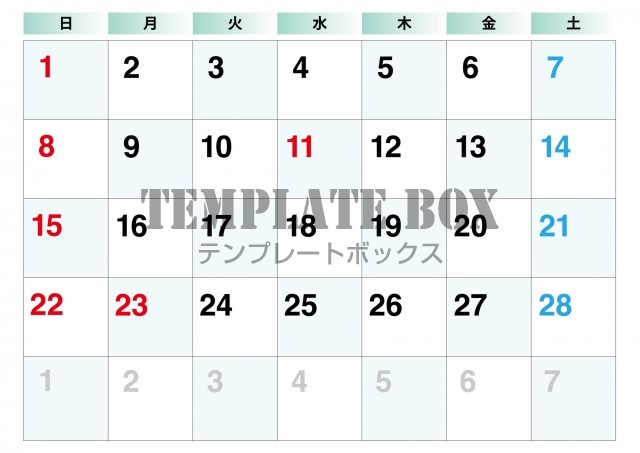2026年2月カレンダー:横型青のカレンダー