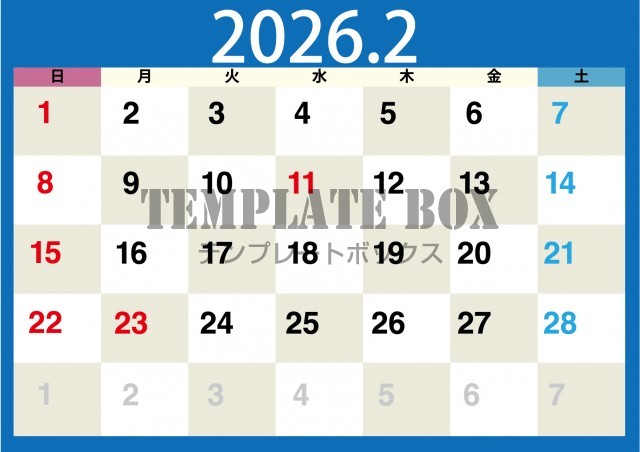 無料テンプレート:2026年2月カレンダー:冬らしいカラーのカレンダー