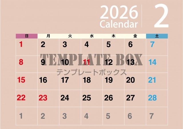 質感あるおしゃれな2026年2月カレンダーです。シンプルな素材ですのでビ…