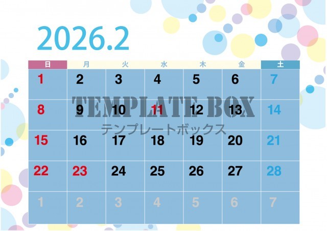 無料テンプレート:2026年2月カレンダー:横型ドット柄カレンダー