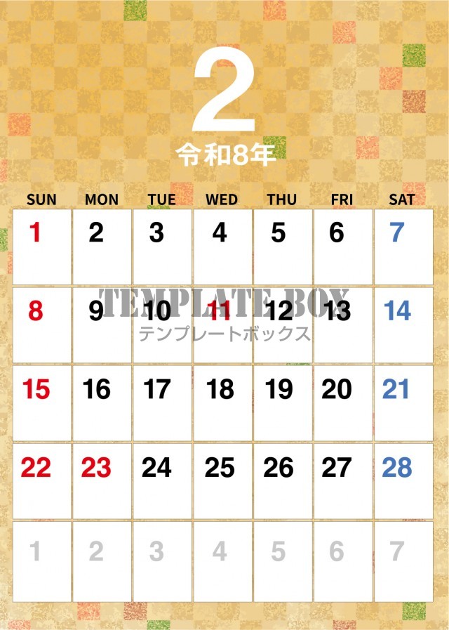 無料テンプレート:2026年2月カレンダー:縦型市松模様柄カレンダー