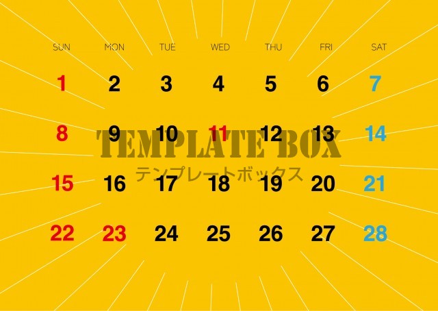 無料テンプレート:2026年2月カレンダー:横型黄色のカレンダー