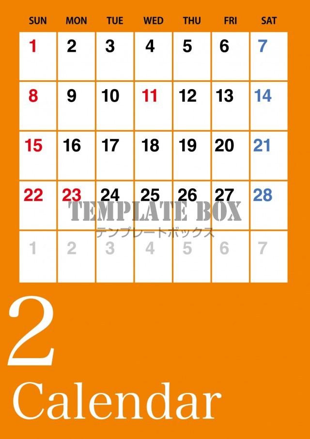 無料テンプレート:2026年2月カレンダー:縦型オレンジカレンダー