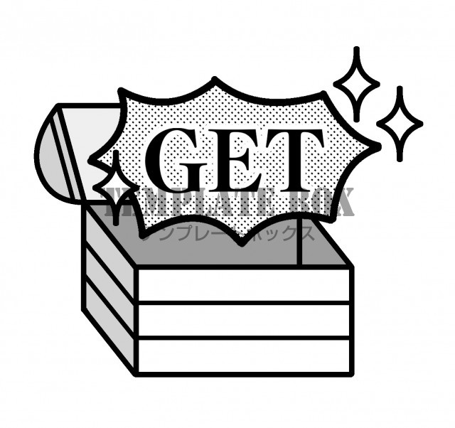 無料イラスト素材:モノクロでシンプルな宝箱からゲットの文字が飛び出しているワンポイント