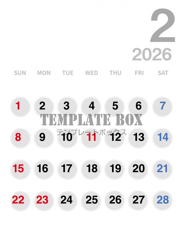 無料テンプレート:2026年2月カレンダー:縦型みやすい美しいカレンダー