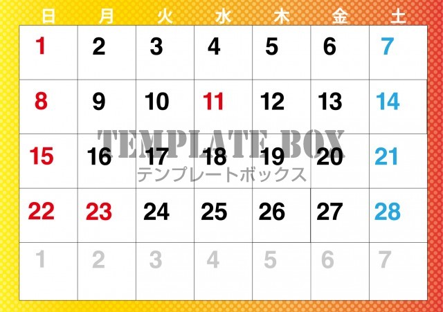 無料テンプレート:2026年2月カレンダー:横型グラデーションのカレンダー