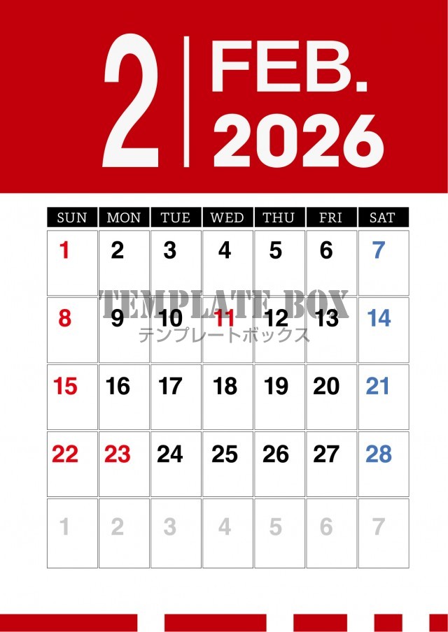 無料テンプレート:2026年2月カレンダー:縦型赤がかっこいいカレンダー
