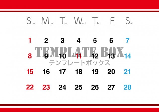 2026年2月カレンダー:シンプル赤いデザイン