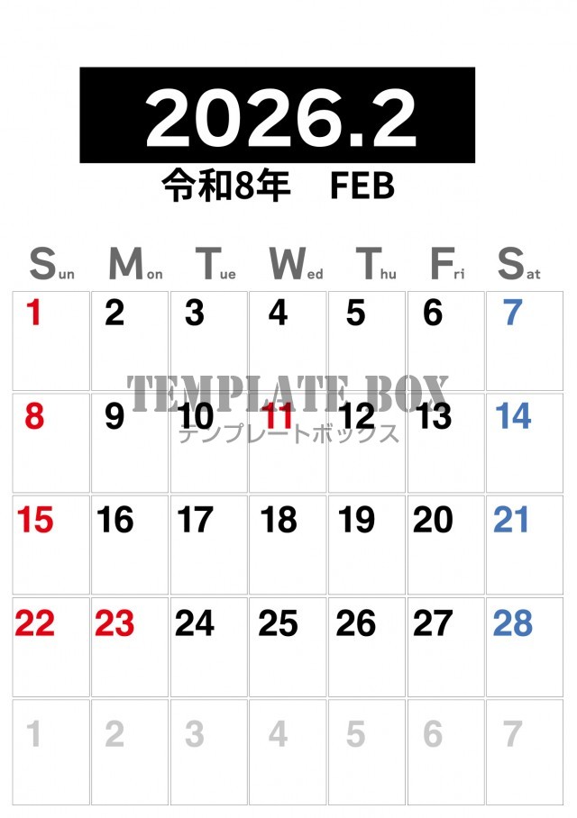 無料テンプレート:2026年2月カレンダー:縦型モノクロカレンダー