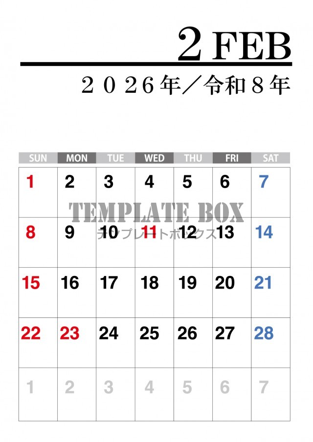 無料テンプレート:2026年2月カレンダー:縦型シンプルデザイン