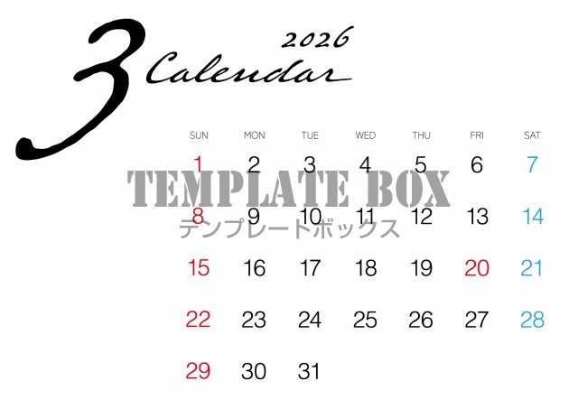 2026年3月カレンダー:横型シンプルデザイン