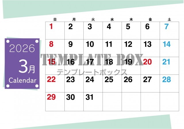 無料テンプレート:2026年3月カレンダー:横型おしゃれなカレンダー